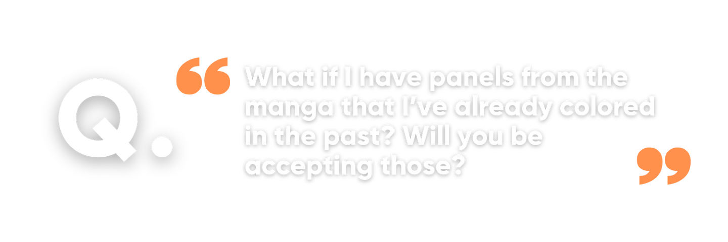 A: We cannot accept previously colored pages or panels. We apologize for the inconvenience, but at this time we will only accept submissions of our assigned pages.